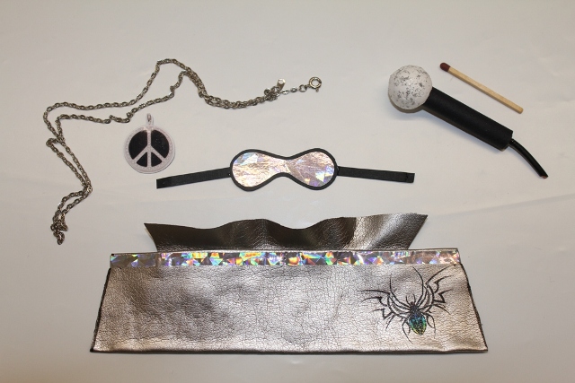 Dekorieren Sie den Stoffstreifen mit Hologrammfolie. Kunstleder können Sie auch mit einem Tattoo bekleben.Für den Kragen haben wir einen flachen, schmalen, Kreisbogen zugeschnitten und angeklebt.